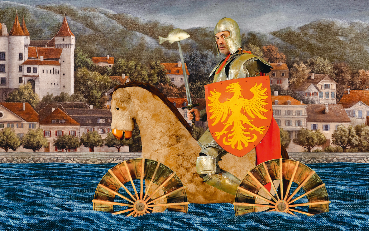 Cela nous a conduit à demander à Pierrick Sorin une réalisation similaire pour illustrer d’une façon décalée l’histoire de notre ville au fil des siècles, avec son château en toile de fonds, et au premier plan, le Léman comme protagoniste. Ainsi, sur diverses barques, en une navigation de plus en plus anarchique, défilent celles et ceux qui ont fait Nyon ou en sont représentatifs : parmi eux, nos ancêtres les « Lacustres », supposés ici farouches, Jules César, fondateur de la Colonia Julia Equestris, un ouvrier de la manufacture d’allumettes Diamond, et, en voisine, Madame de Staël, la baronne de Coppet. Il y a également un preux chevalier, membre des dynastes de Cossonay-Prangins, les premiers possesseurs du château de Nyon, Gustave Falconnier, jonglant avec ses briques de verre, tout comme Jean-Luc Godard ou Auguste Piccard, qui inspira le bien connu professeur Tournesol créé par Hergé. Le tout mêlé à des projections de Visions du Réel, des théières de la manufacture de porcelaine et un feu d’artifice final, comme chaque année à Paléo.